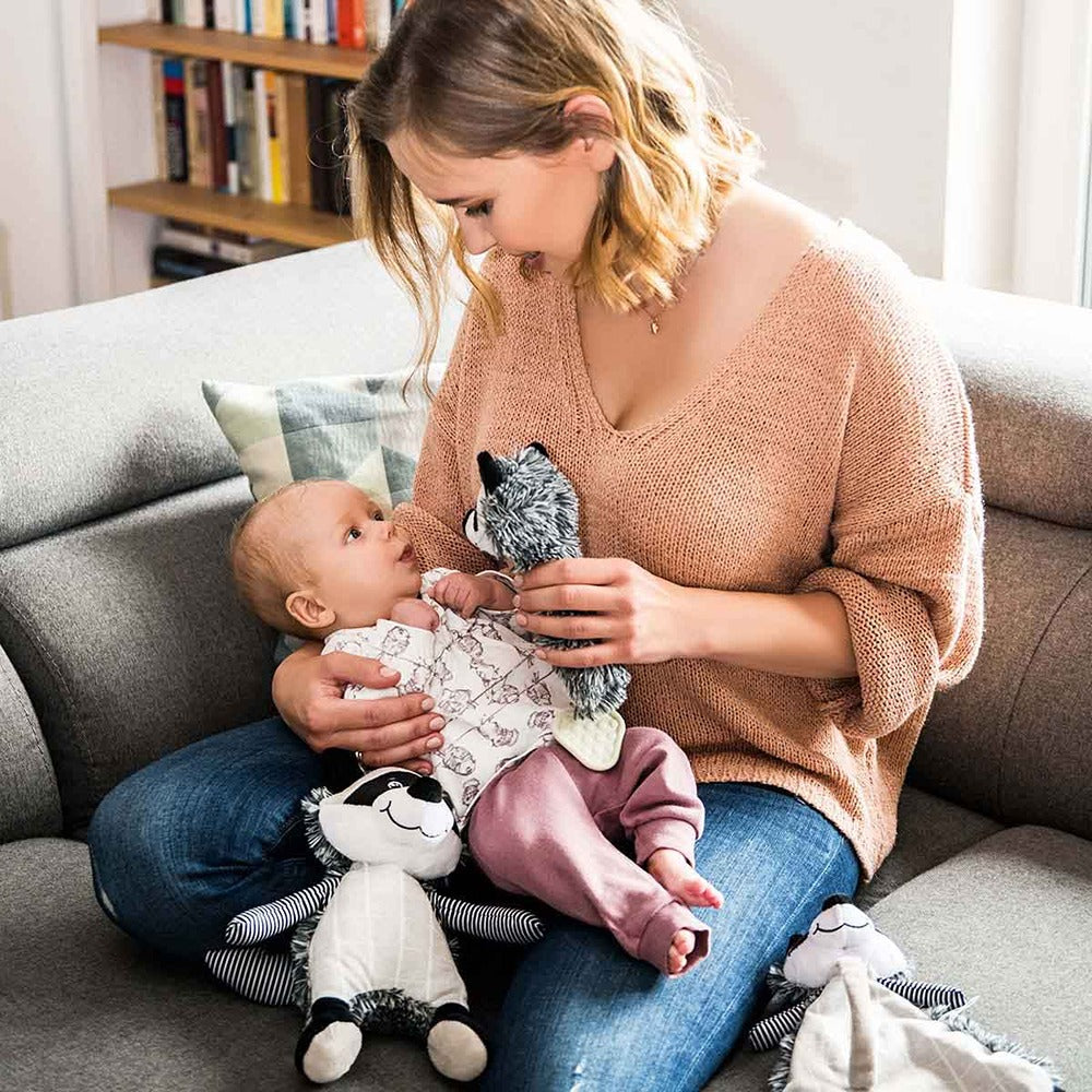Das weiche Maskottchen besteht aus verschiedenen Materialien mit interessanten Strukturen und die Rassel im Inneren fördert die kognitiven Fähigkeiten eines Kleinkindes und vermittelt gleichzeitig ein Gefühl von Geborgenheit.
