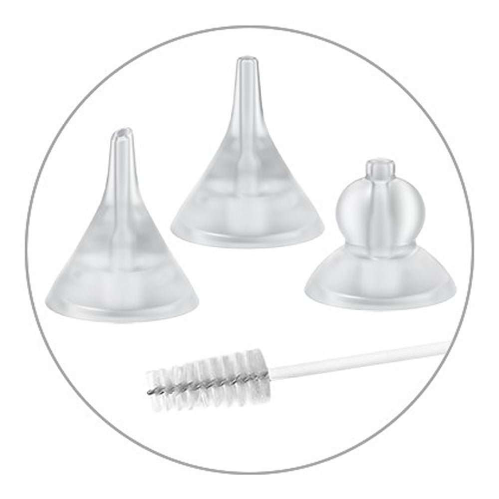 3 punte in silicone ultra-morbide, regolabili in base al tipo di secrezioni e all'età del bambino. Spazzolino aggiuntivo per la pulizia incluso. Garantito per essere igienico e adatto alle esigenze dei più piccoli.