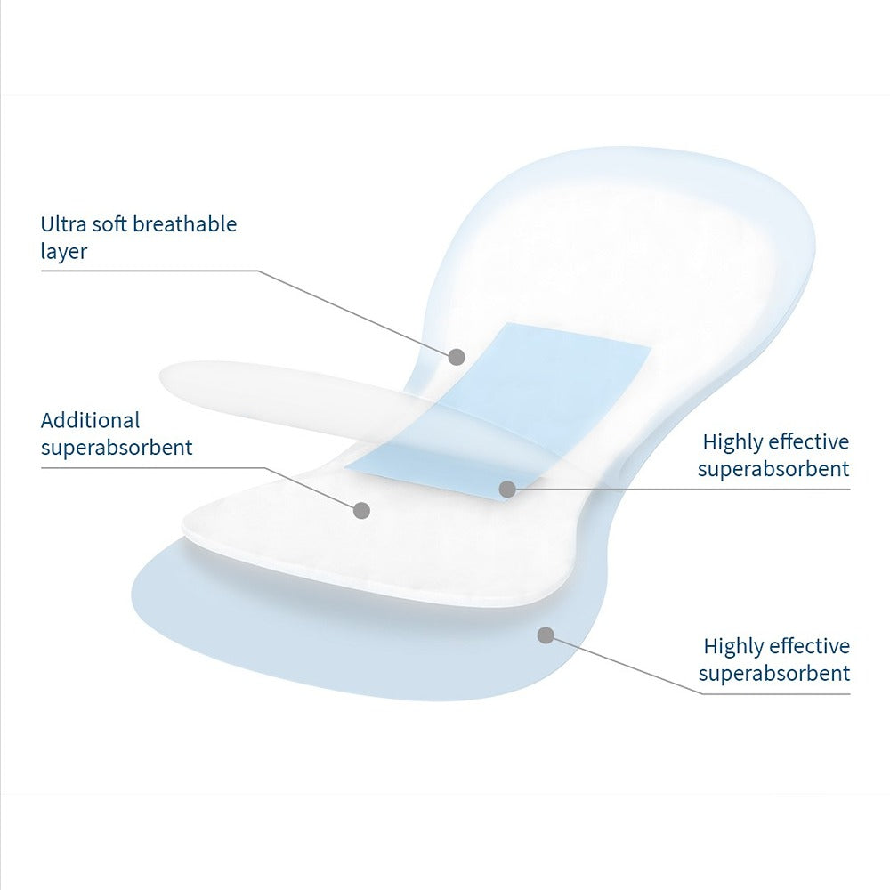 Ogni assorbente è composto da quattro strati. La superficie interna traspirante e ultra morbida consente la circolazione dell'aria e offre una sensazione di freschezza. Due strati superassorbenti trattengono l'umidità, trattenendo i liquidi all'interno dell'assorbente e neutralizzando i cattivi odori. Lo strato esterno in lamina previene le perdite, mantenendo la biancheria intima pulita.
