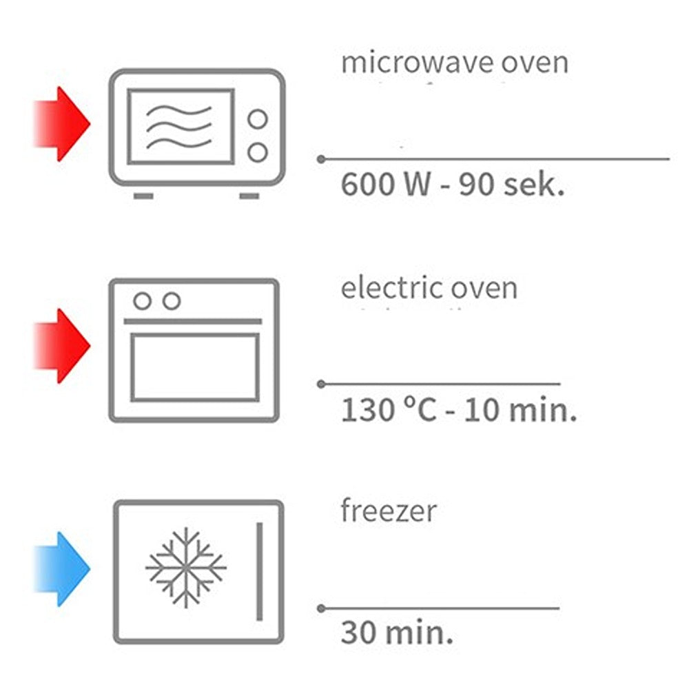 - Mettere l'inserto nel forno a microonde (600 W - 90 sec.), nel forno elettrico (130 °C - 10 min.) o sul termosifone (finché non è sufficientemente caldo)