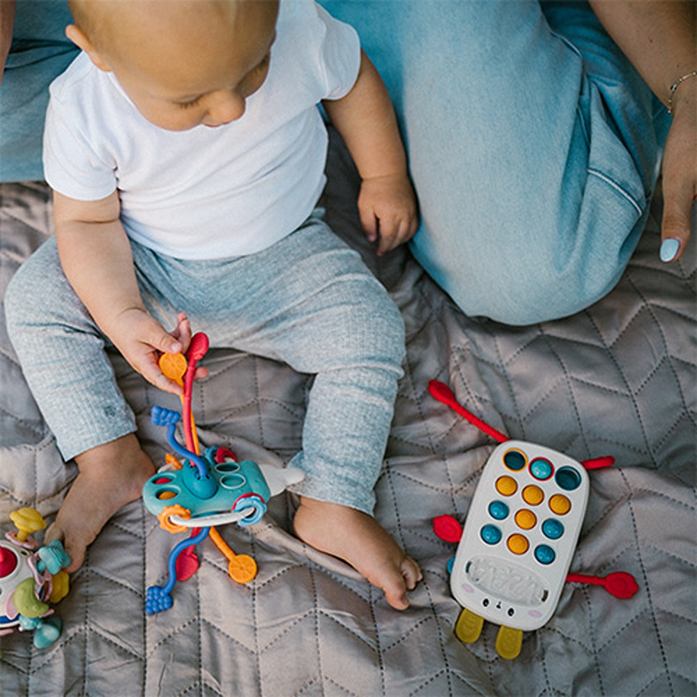 Il giocattolo è composto da vari pezzi realizzati in silicone sicuro e plastica resistente . Il bambino può strizzarlo, premerlo, trascinarlo e muoverlo. Questo lo rende più attraente agli occhi del bambino e lo incoraggia a esplorare il mondo in modo attivo e creativo.