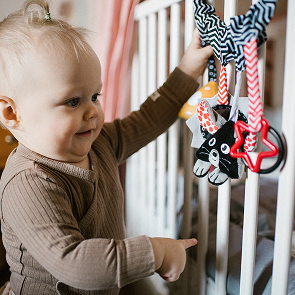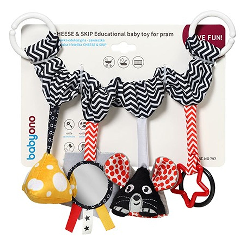 Cheese & Skip è un gioco sensoriale che stimola il tatto e la vista, oltre a favorire lo sviluppo delle capacità motorie del bambino. Fissalo al passeggino, alla culla o al seggiolino auto per intrattenere il tuo bambino durante le passeggiate o i viaggi. Quattro elementi sono appesi alla parte rivestita in delicato tessuto: un pezzo di formaggio giallo che tintinna, uno specchio sicuro con estensioni colorate, un topo con orecchie fruscianti e un contorno a forma di cerchio e stella. L'interessante scelta di elementi incoraggia la scoperta e attira l'attenzione del bambino con i suoi diversi design e i colori ad alto contrasto. Il bambino giocherà, scoprirà il mondo e perfezionerà la sua coordinazione occhio-orecchio allo stesso tempo.