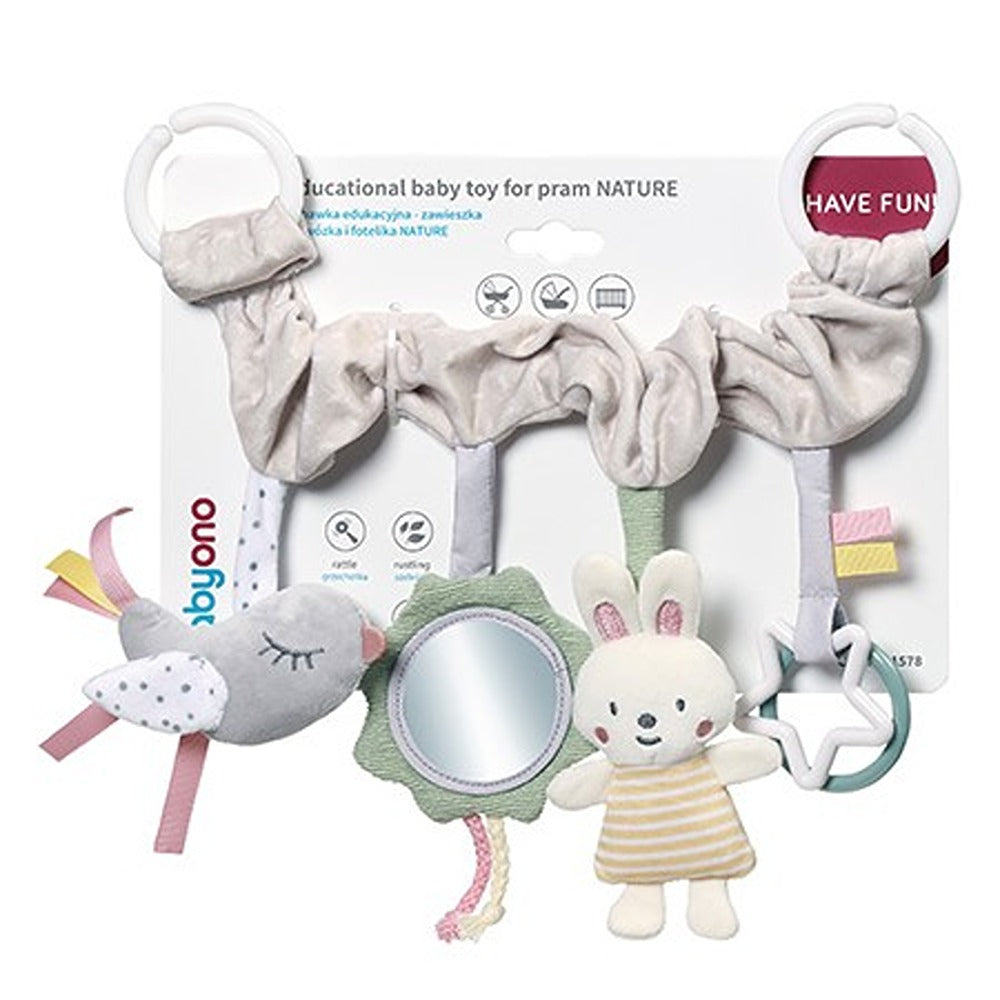 Il giocattolo da appendere NATURE per carrozzina e seggiolino auto è un prodotto sensoriale che può stimolare il tatto e la vista del bambino, oltre a migliorare le sue capacità motorie. Tutto ciò che devi fare è attaccarlo alla carrozzina, alla culla o al seggiolino auto per intrattenere il tuo bambino durante le passeggiate e i viaggi. L'articolo da appendere, rivestito in un tessuto piacevole al tatto, è dotato di un uccellino sonaglio, uno specchio di sicurezza e corde sporgenti, un coniglietto frusciante , un anello e una stella . I pezzi accuratamente selezionati sono attraenti e catturano l'attenzione del bambino . Il tuo piccolo può giocare, scoprire il mondo e sviluppare la vista e l'udito.