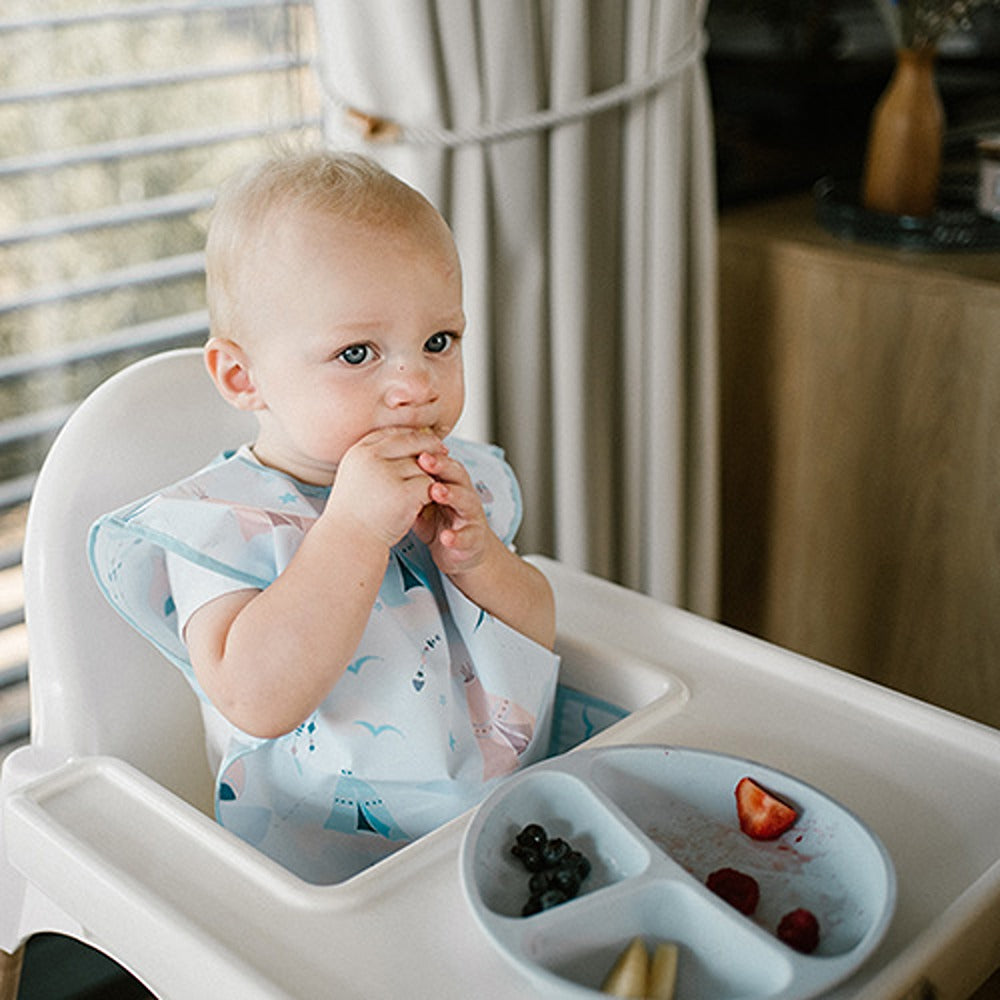 Essendo impermeabile e facile da pulire, il grembiule può essere utilizzato mentre il bambino impara a mangiare da solo.