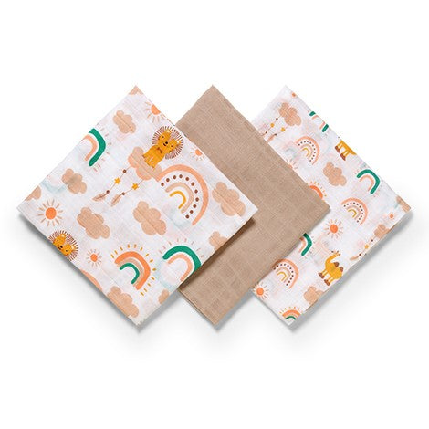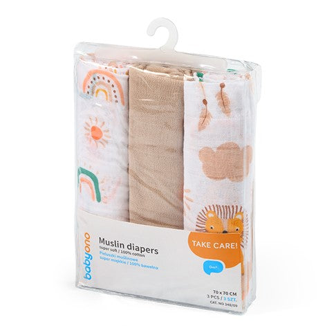 Le mussole super morbidi sono un must-have nel primo corredino di un bambino: sono utili per neonati e bambini piccoli. La muslin è un tessuto a doppio strato, 100% cotone, estremamente morbido al tatto e insolitamente traspirante, quindi i pannolini in muslin possono essere utilizzati fin dal primo giorno di vita del bambino: per avvolgerlo o coprirlo, oppure come fasciatoio, lenzuolo o asciugamano da bagno. Sono comodi come copertina durante l'allattamento o puoi metterli sulla spalla quando devi fargli fare il ruttino. Confezionati in una scatola trasparente con chiusura in velcro.