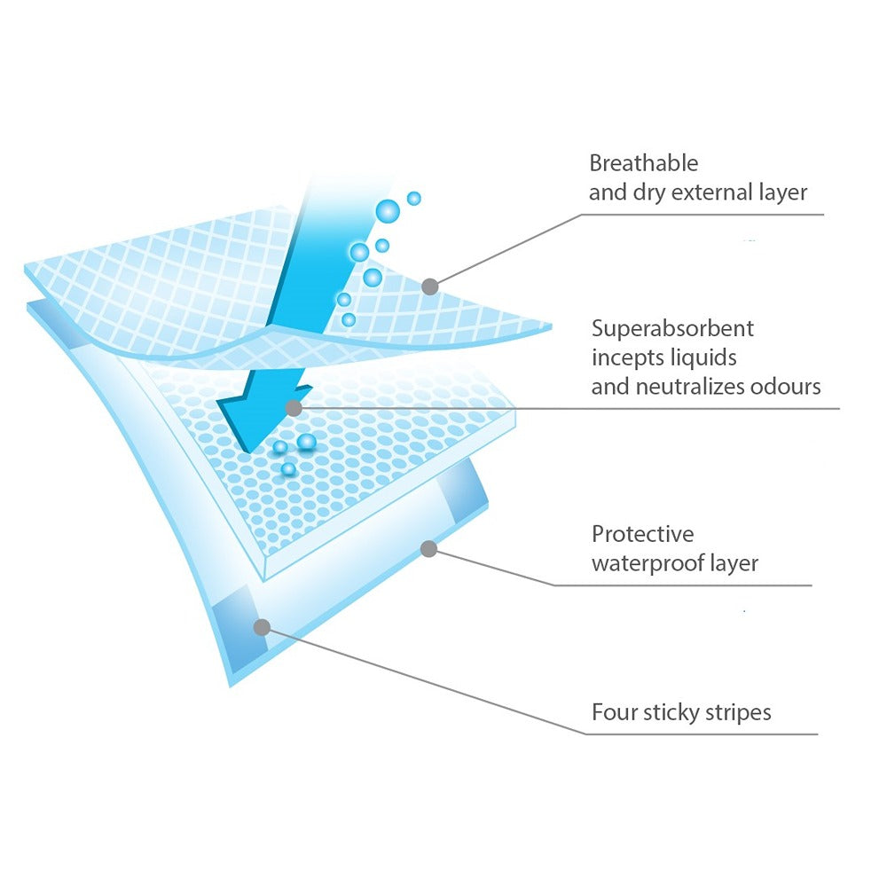 Le traverse assorbenti igieniche monouso sono perfetti per il cambio del pannolino e pensati per le donne nel periodo post-parto. Gli assorbenti altamente assorbenti offrono una sensazione di igiene e comfort. L'involucro esterno protegge dallo sporco, mentre le strisce autoadesive impediscono che scivolino. L'interno super assorbente dell'assorbente assorbe rapidamente i liquidi e neutralizza i cattivi odori.