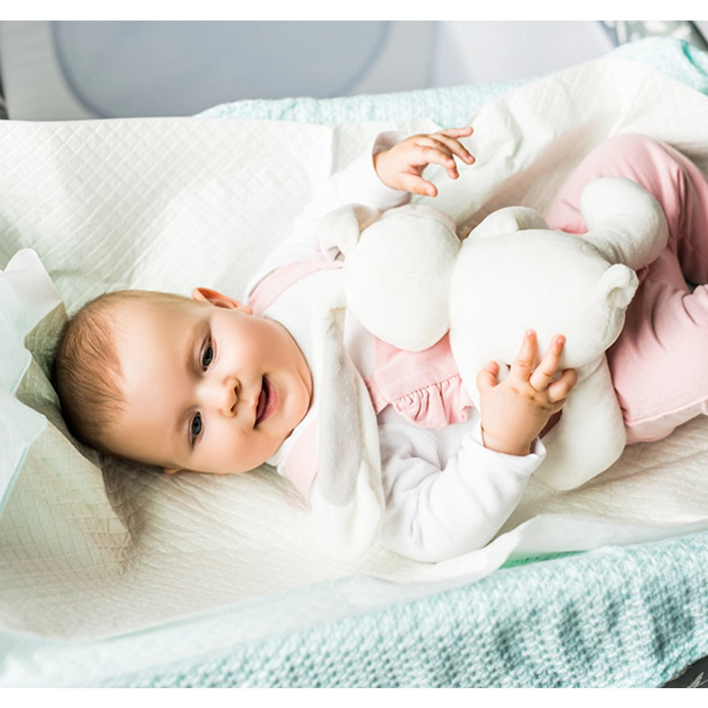 I materassini fasciatoio monouso sono un valido aiuto per cambiare il pannolino al neonato e possono essere utilizzati anche dalle donne nel periodo post-partum. I materassini eccezionalmente assorbenti garantiscono comfort e igiene. Il rivestimento esterno in plastica protegge dallo sporco, mentre le strisce autoadesive mantengono i materassini in posizione. Il materiale super assorbente all'interno del materassino assorbente assorbe rapidamente l'umidità, neutralizzando eventuali odori sgradevoli.